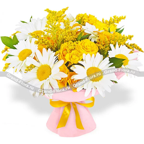 Стандартный (на фото): ромашка белая - 7 шт, роза кустовая желтая - 5 шт, солидаго - 4 шт, рускус, фетр светлый, желтый бант.